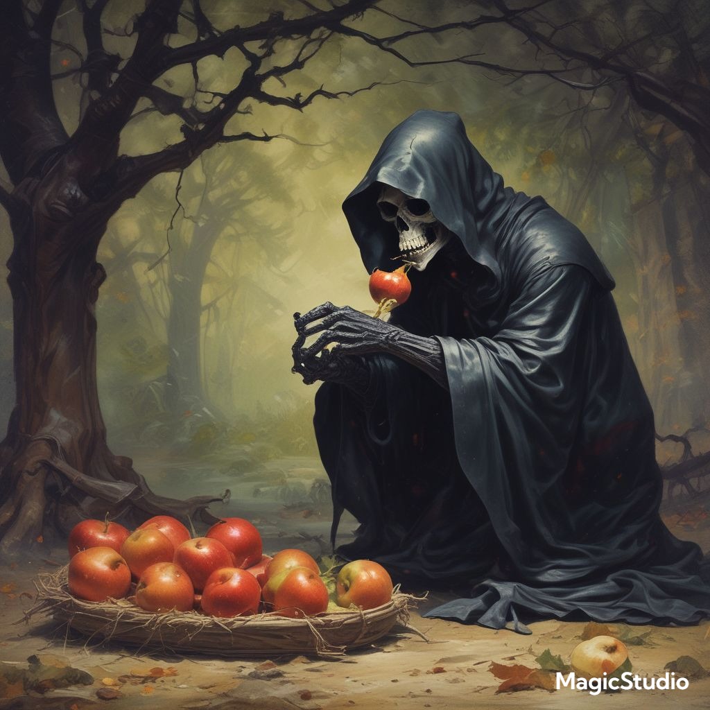 Having grown fond of Gaia’s world, I allowed myself to soak in the pleasure of the landscape she created as I pondered further about what to do next. Surrounded by fruit trees, I plucked one of the red orbs that were hanging everywhere around me; Adam had named this fruit Apple and he seemed rather fond of them, so I took a bite into the flesh – it was tart but sweet. I liked it immediately – then proceeded to eat the entire orchard.