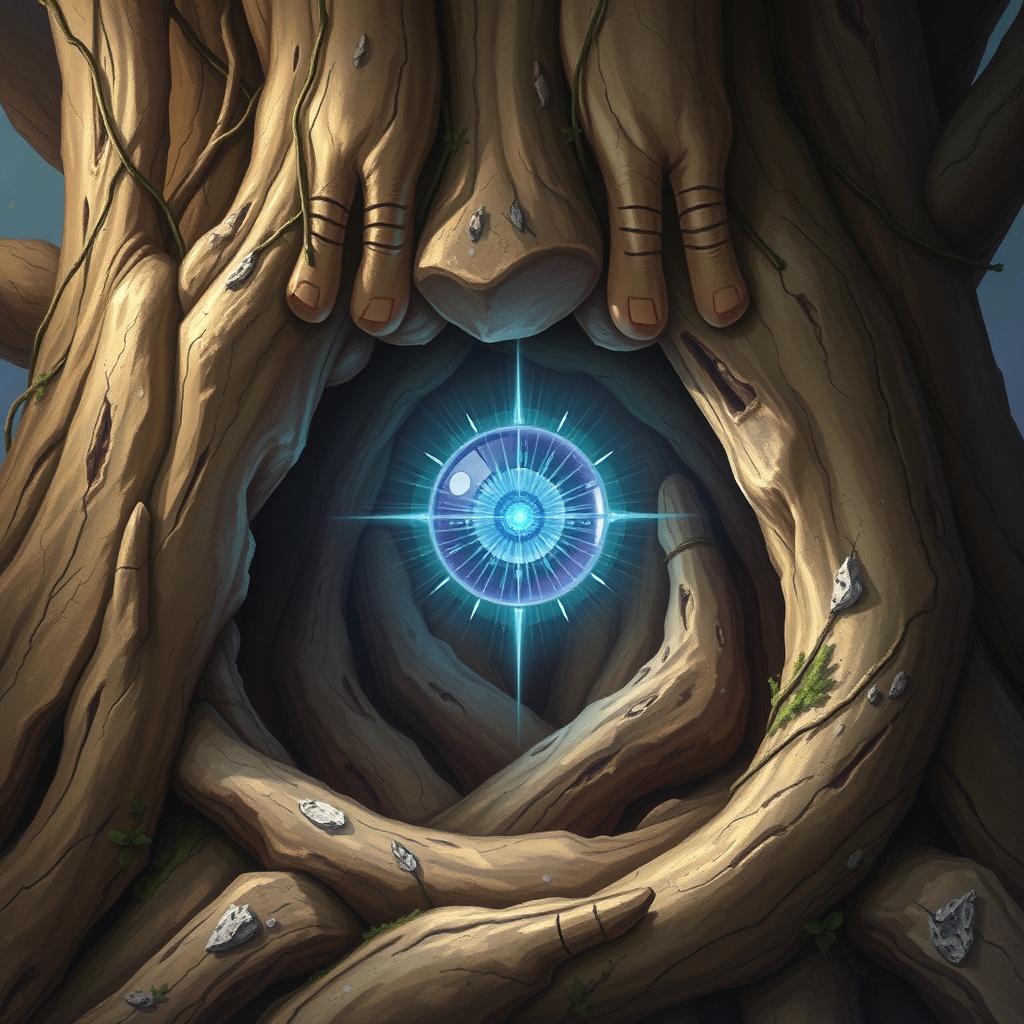 There, nestled inside the roots of an ancient tree, something was calling me —a relic of immense power. It was a crystalline orb and it pulsated with a faint, otherworldly light.