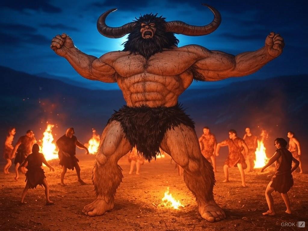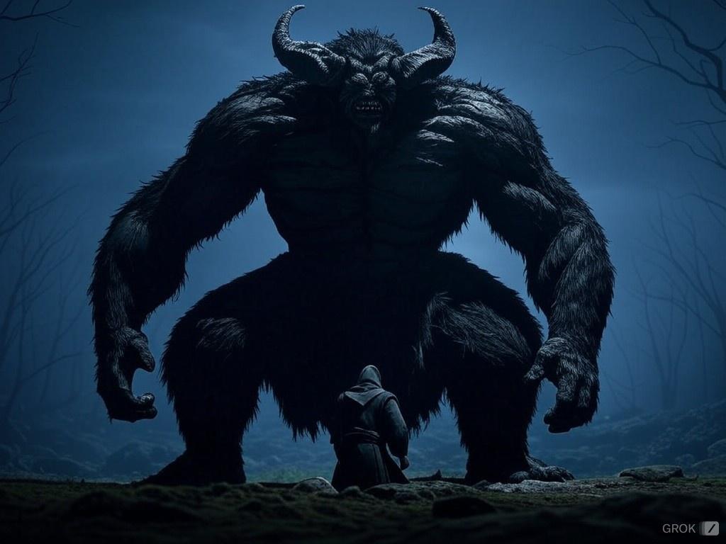 I would see that Kane was awestruck at the monstrosity that stood before him — my made up deity a giant whose form was a grotesque amalgamation of human and beast. With a body covered in matted black fur thick and coarse like the pelt of a wild beast, Baal’s muscular frame, twisted and deformed, exuded a raw primal power with bulging veins that pulsed with a dark energy. Massive horns, twisted and gnarled like ancient tree roots, jutted out from my god’s skull, their tips sharp and menacing. [What, you think the horns were a bit much?].