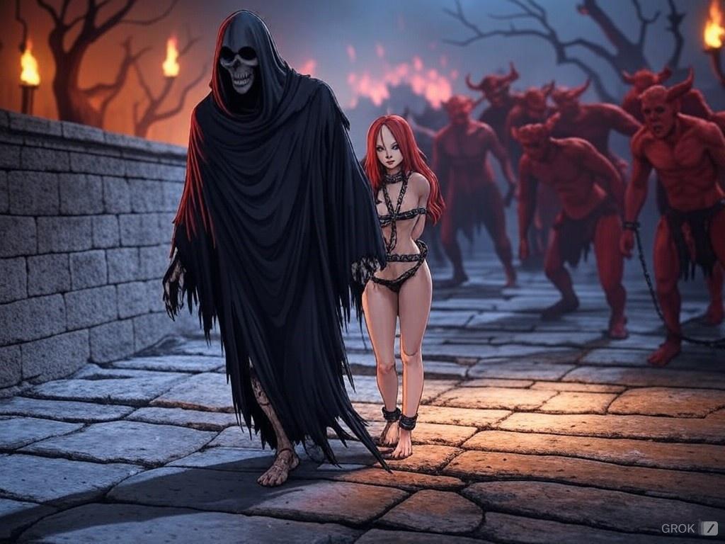 As I forged ahead to meet my destiny, I dragged Lilith behind, her hands and feet in shackles. I could sense that she was trying to walk with confidence, yet it was obvious that her once proud demeanor was now subdued by the weight of captivity and the knowledge of the power surrounding her. [Of course the way I’d tortured her prior to coming here probably had something to do with that too].