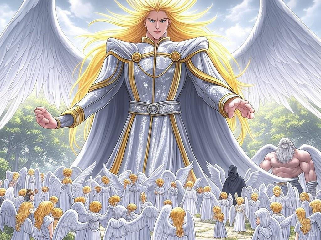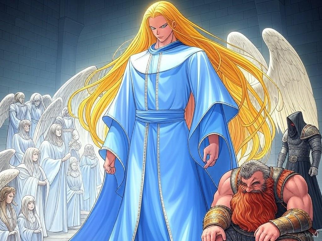 With golden hair that fell over his shoulders like a waterfall of light, Gabriel’s face was serene, yet commanding. Clad in robes that seemed woven from starlight, the cloth was adorned with Illyrian symbols of heavenly power. His wings, on full display, were vast, shimmering, and spread wide behind him, each feather a masterpiece of divine craftsmanship, capable of summoning the winds of Illyria. In his presence, time seemed to slow, and the very air vibrated with the harmonies of the cosmos.