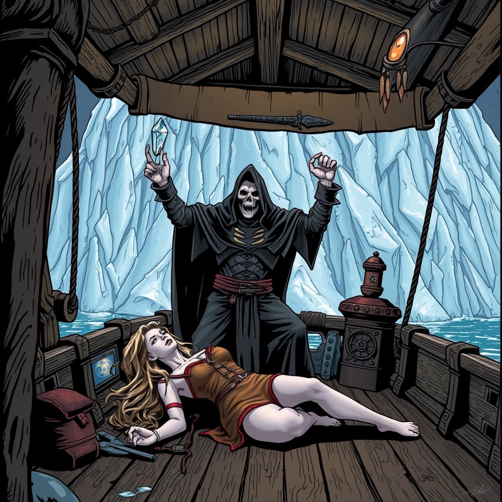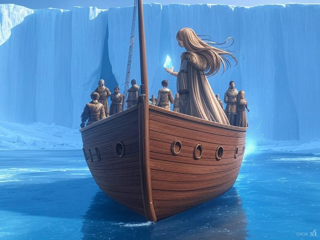Then it was that tension grew palpable among the crew of Debor’s vessel. Although the first ice wall had been an awe-inspiring sight for Debor, it paled in comparison to the frozen monolith that confronted her now. This original ice wall stretched endlessly in both directions, a sheer, vertical barrier of shimmering, crystalline ice that glowed with an eerie blue light. Debor could see that its surface was smooth yet foreboding, its translucent depths appearing to show ancient, swirling patterns that seemed to move and shift as if the ice itself was alive.