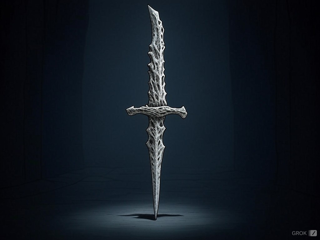 The dagger’s handle was straight and unadorned – without even a wrap for a grip — and where a base or pommel might have been, the bone looked as if it had been merely snapped off. The hilt was an extension of the blade bone that had grown outward at opposing angles to form an upside down “V,” with barbed tips that extended towards the tip of the dagger. But most gruesome of all was the actual blade — a illogically distorted corkscrew of bone that twisted its way in width, from the size of a fist, down through its coils, to an almost invisible tip — a point so sharp that its final apex was invisible to the naked eye, for so keen were its edges.