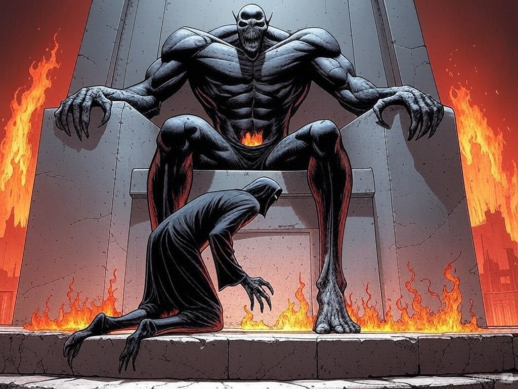 For, despite Illusia’s size, still I was never able to enter that world without my master immediately knowing the very moment I had arrived; without Baal-Zebub calling me the second I had taken that last step down the Stairway of Infinity; without the Dark Lord forcing me to instantly obey its summons, and then imprisoning me before its throne for 100 years! There, at its foot, groveling in hopeless agony, there did Evil transform tself into a monster while It enslaved Death (that’s me!) with the sinister malevolence of its rabid ravings.