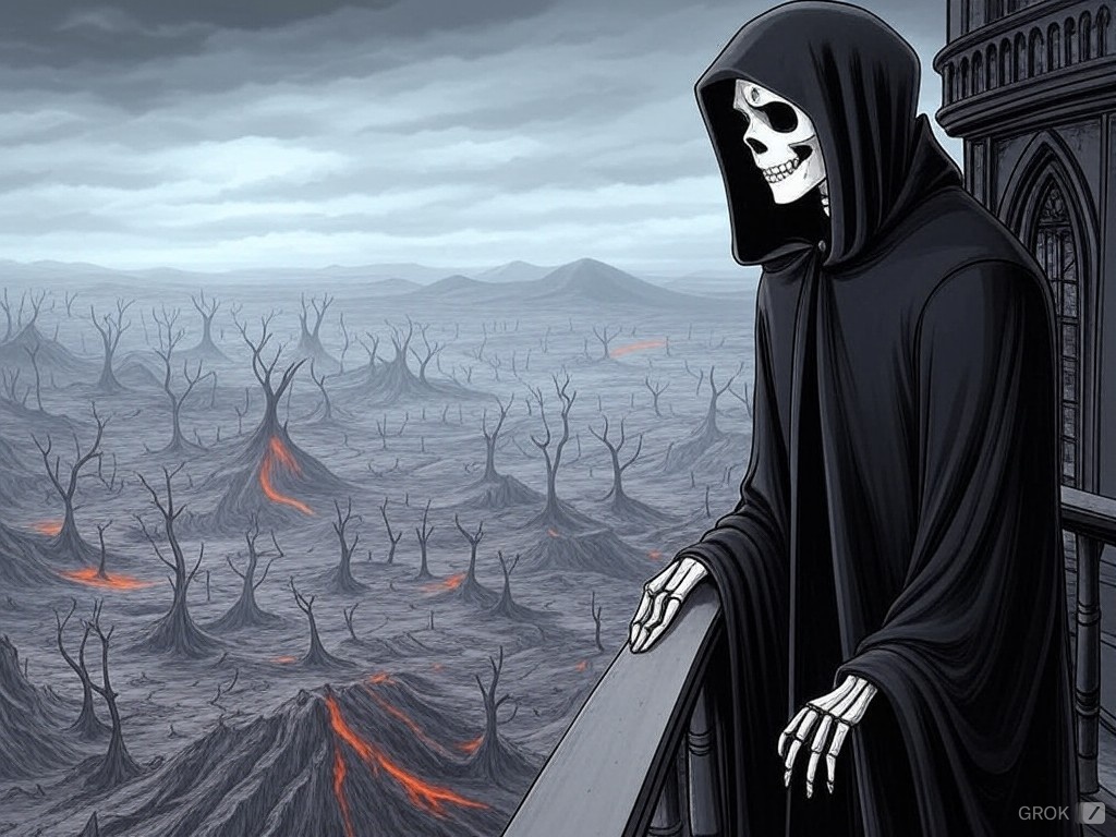 One evening I was standing on one of my balconies at The Cauldron – looking out over the lands of Kra. From my vantage point, high upon the side of the volcano, I could see the bleak, barren landscape stretching out before me. The petrified forest below was a twisted maze of ash-covered trees, remnants of a long-ago volcanic explosion that had left the land scarred and lifeless. The air was thick with the scent of sulfur, and the sky was perpetually overcast, casting a gloomy pall over the desolate terrain – filling me with happiness and setting my mind to thinking.