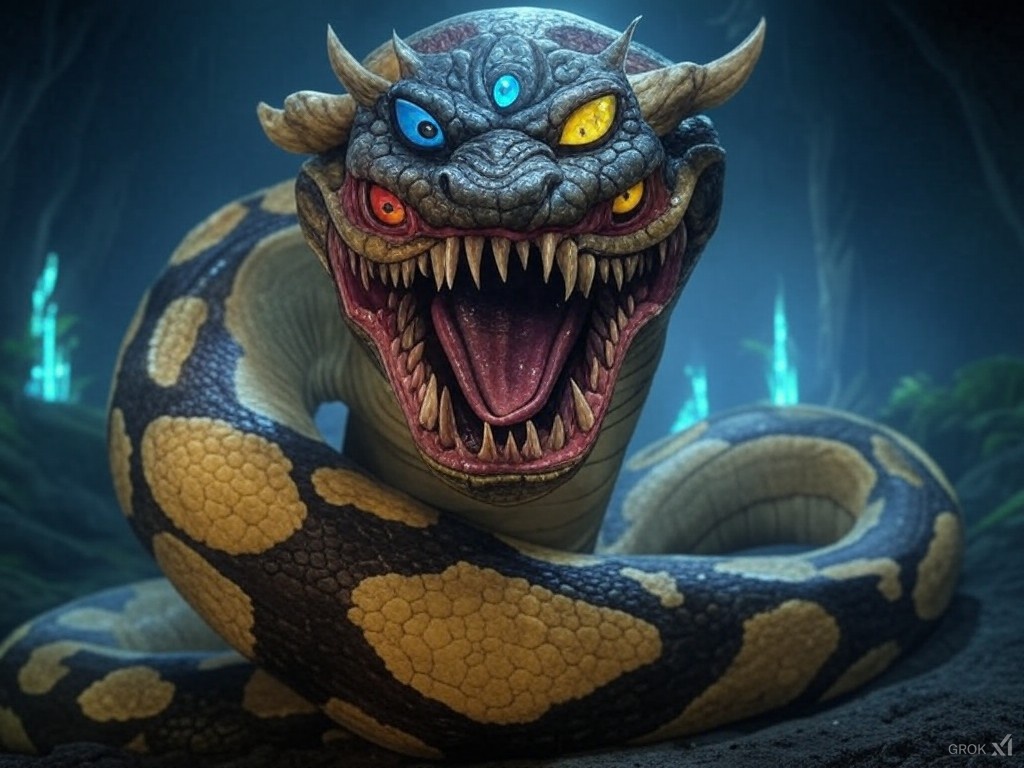 If you’re wondering what a Krangor is, let me help you. Even among the Drokka, the Krangor was of the stuff of legends – a fearsome beast of the deep that took the life of the famous Burner Stynbakker – that miner who discovered Rhokkium – that gem even stronger than diamonds. Although none alive today had seen the beast, The Kroniklz described the Krangor as a slithery snake-like monster, with a horned, armored visage and six sets of predatory eyes that glowed with the ever-changing hues of gemstones. Complete with a maw that housed multiple rows of glittering teeth – made of Rhokkium – the Krangor was said to be capable of biting its way through the rocks of the underworld, thus allowing it to freely move wherever it pleased in the bowels of the flat Earth.