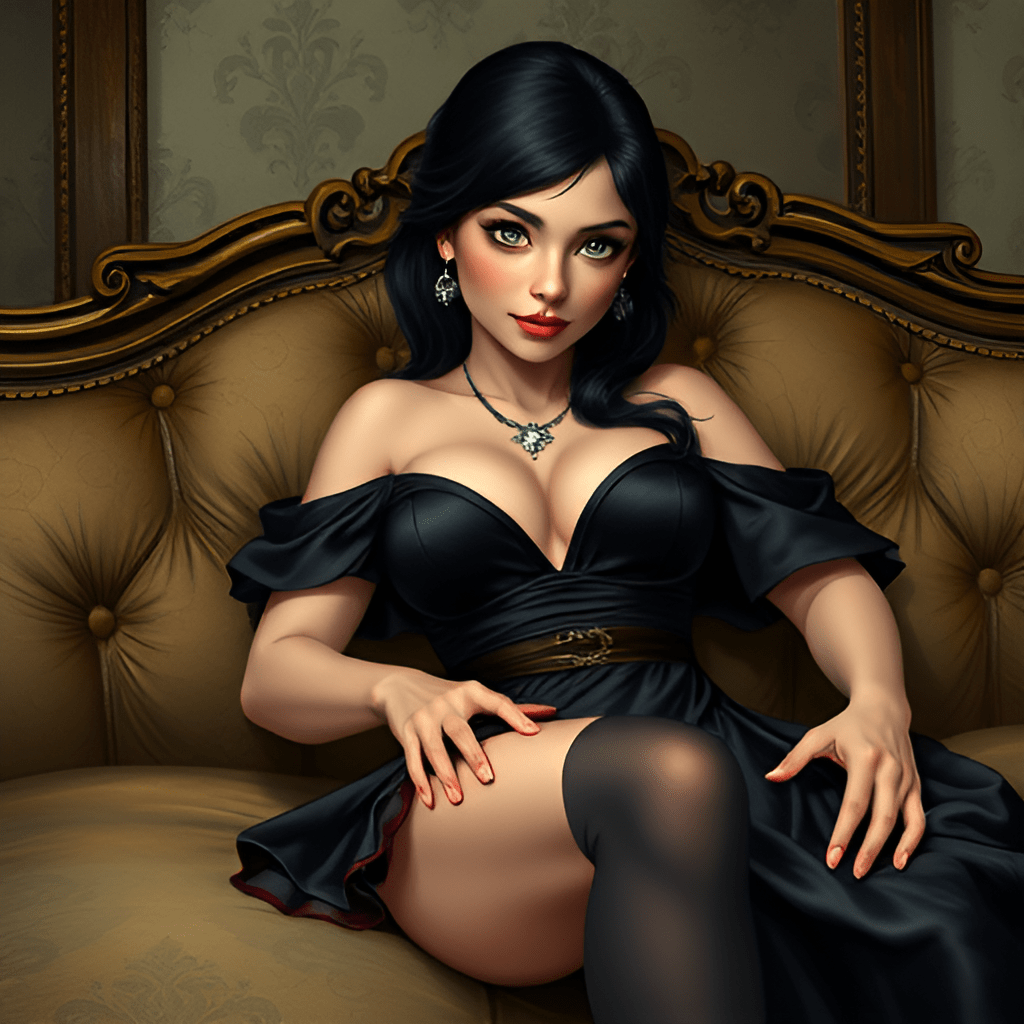 Hecla knew she was dressed a bit risqué for a princess. Her dress, a daring creation of black silk, clung to her curves, the fabric shimmering with each subtle movement. Her neckline plunged provocatively, and the hemline flirted with immodesty, leaving just enough to the imagination. The jewels around her neck and wrists sparkled in the dim light, drawing attention to her every gesture. As she reclined on the divan, her fingers traced lazy patterns on her exposed thigh, her eyes never leaving Hacktor, a knowing smile playing on her lips.
