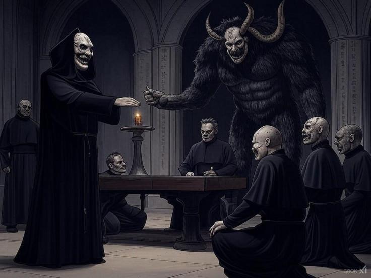 On the rare occasions that their groups met in super secret locations, human sacrifice, torture, and worse were on the menu – as was the drinking of human blood (for I’d led them to revive the infamous Derkka King Bashumel’s “The Feast of Shadows” – a ritual where victims were drained of blood to feed a dark flame that The Priory’s high priest ‘washed in the flames’ in order to release the blood’s ‘Adrenochrome’ – allegedly granting those who drank it eternal youth. Yet what these elite fools didn’t know was that not only was Bashumel’s ritual a farce, but more importantly I had no intention of ever gifting them any part of the flat earth for helping Baal.