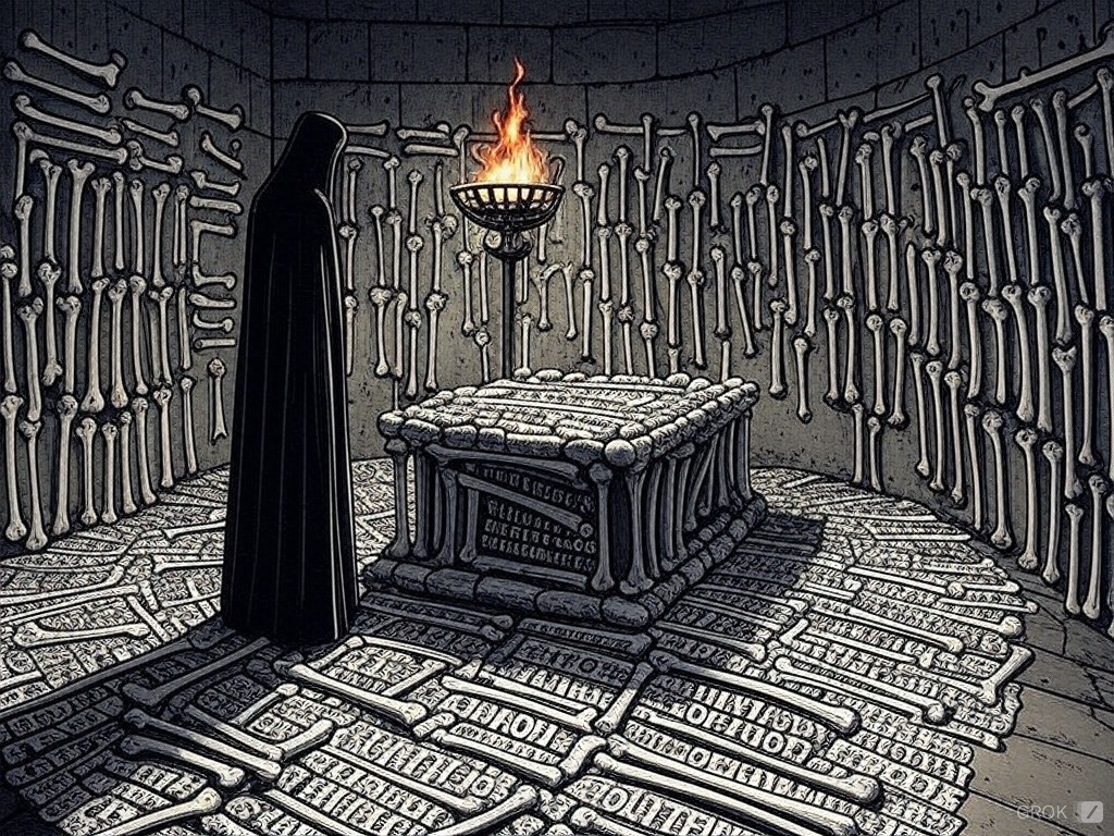 The brazier’s flames cast grotesque shadows across the room, illuminating a grisly altar that dominated the center of the space. The altar was made of the fused remains of countless dead, their twisted bones and skulls forming a macabre throne from which I could command the spirits of the damned. Around the altar, the floor was covered in a mosaic of bones, each one inscribed with the name of the soul it once housed – it was meticulous work, but when you are a god you have all the time in the world to pay attention to the little things.