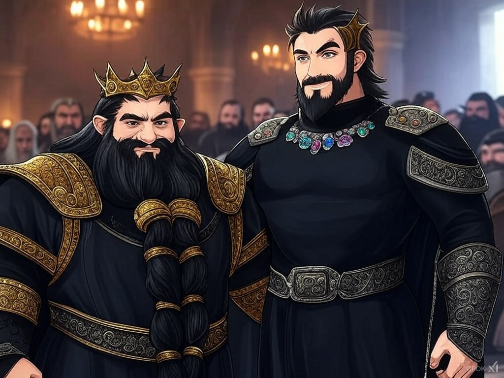 Belgrath, the famous Drokka bard, was a sight to behold. Taller than most of his dwarfish race, his dark hair and beard framed a face that could only be described as divine. His eyes, a mesmerizing shade of sapphire, scanned the room with a mixture of confidence and amusement, as though he were fully aware of the effect he had on those around him. He was dressed simply, in a leather breeks and a vest of the same material – the shirt clinging to his muscular frame, revealing his lithe physique.