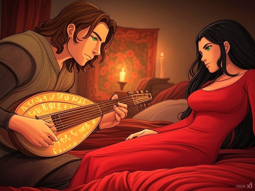 The name alone sent a thrill through her. The bard had captivated the court just days earlier with his haunting song in honor of Baldur, and since then, he had become the talk of Rhokki Pass. His music, his presence, had ignited something within Hecla —a yearning for something more, something beyond the walls of the palace and the duties of her station.