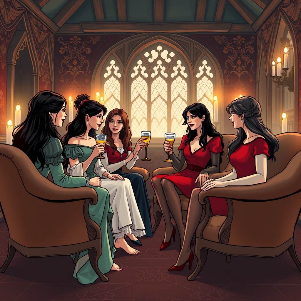 Hecla, resplendent in a flowing gown of deep crimson, moved gracefully among her guests, her raven’s hair cascading over her shoulders like a waterfall of living blackwood. Despite the cheerful atmosphere, her mind was elsewhere—on the encounter with her brother Hacktor just hours before. She had tried, once again, to rekindle the spark between them, to draw him back into the connection they once shared. But Hacktor had rebuffed her, his focus now entirely on his path to power, a path that left no room for her desires.