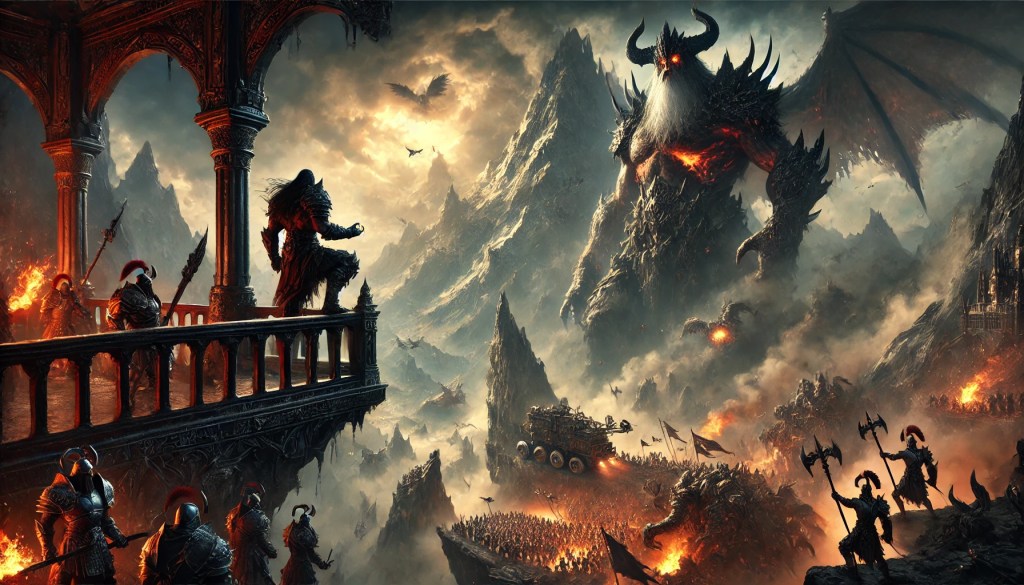 The commanders of Hacktor’s cavalry quickly organized their troops into battle formations – this was done under the cover of the hills that separated them from the view of their enemy that was sacking Oz. As the riders waited, the tension was palpable, the weight of the moment pressing down on them. Hacktor dismounted before his warriors, drawing The Ghast, and raised it high for all to see. The blade seemed to absorb the light around it, pulsing with a dark energy that resonated with the warriors’ battle-hardened hearts.