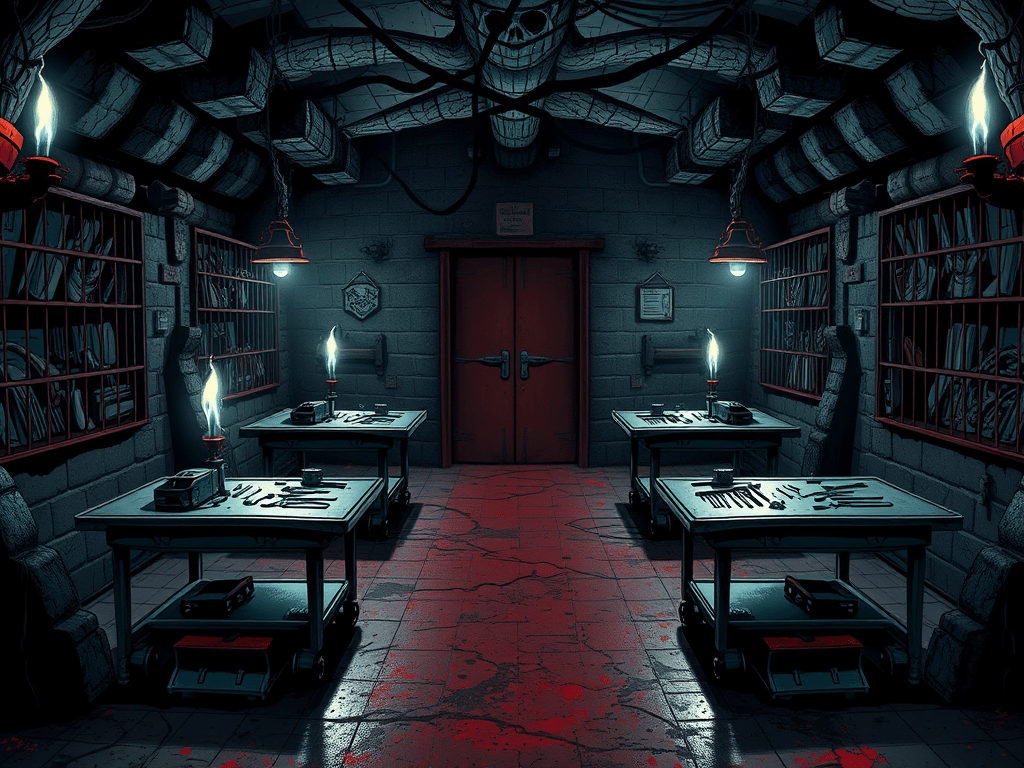 Yet, Room 101 was a testament to my scientific glory, a workshop designed with meticulous precision. Cages of various sizes lined the wall opposite the entrance, their iron bars unyielding, each waiting to hold my next victim. A small wooden chest sat tucked away under a long buffet on the northern wall—a curious item with a story of its own, one I might share another time, for its contents hold secrets even darker than those of this lab. And then there was the room’s centerpiece – four metal tables that dominated the scene, each a custom manufacture of my own design, their steel surfaces gleaming with an icy sheen that belied their grim purpose.