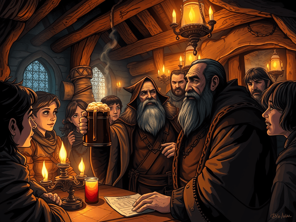 Behind the bar, Aldom Mercaldo, the stout innkeeper with a perpetual scowl, poured another round of drinks, his gaze narrowing as Emcorae entered. Aldom realized quickly that the boy was no paying customer; worse, he was here to drag away the Brandonale’s most garrulous entertainer—Alfranco—whose departure would likely prompt others to head home as well, thinning the night’s profits.