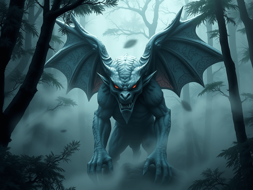The black haze slithered nearer, now yards from his window. Emcorae’s eyes traced its serpentine path backward, and there, shrouded by trees, he saw it—a gray-green, scaled creature with vast wings, clutching a clay pot from which the ebon smoke poured. Its red eyes locked onto his, a maleficent grin spreading across its face as it pointed a clawed finger at him, claiming him.